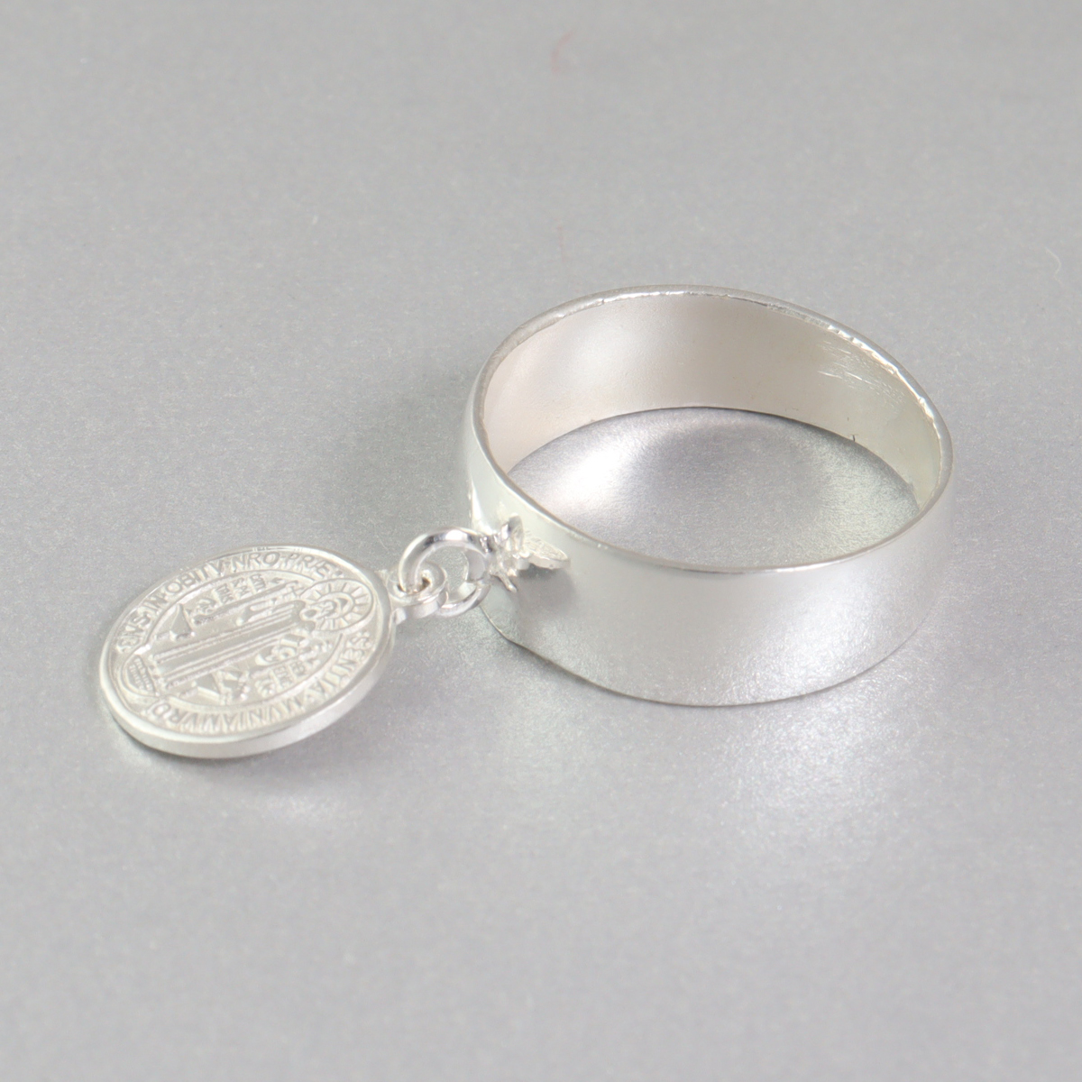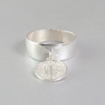 El movimiento del dije colgante añade un detalle distintivo que hace que el anillo de plata 925 con san benito tenga una presencia especial dentro de la joyería religiosa.