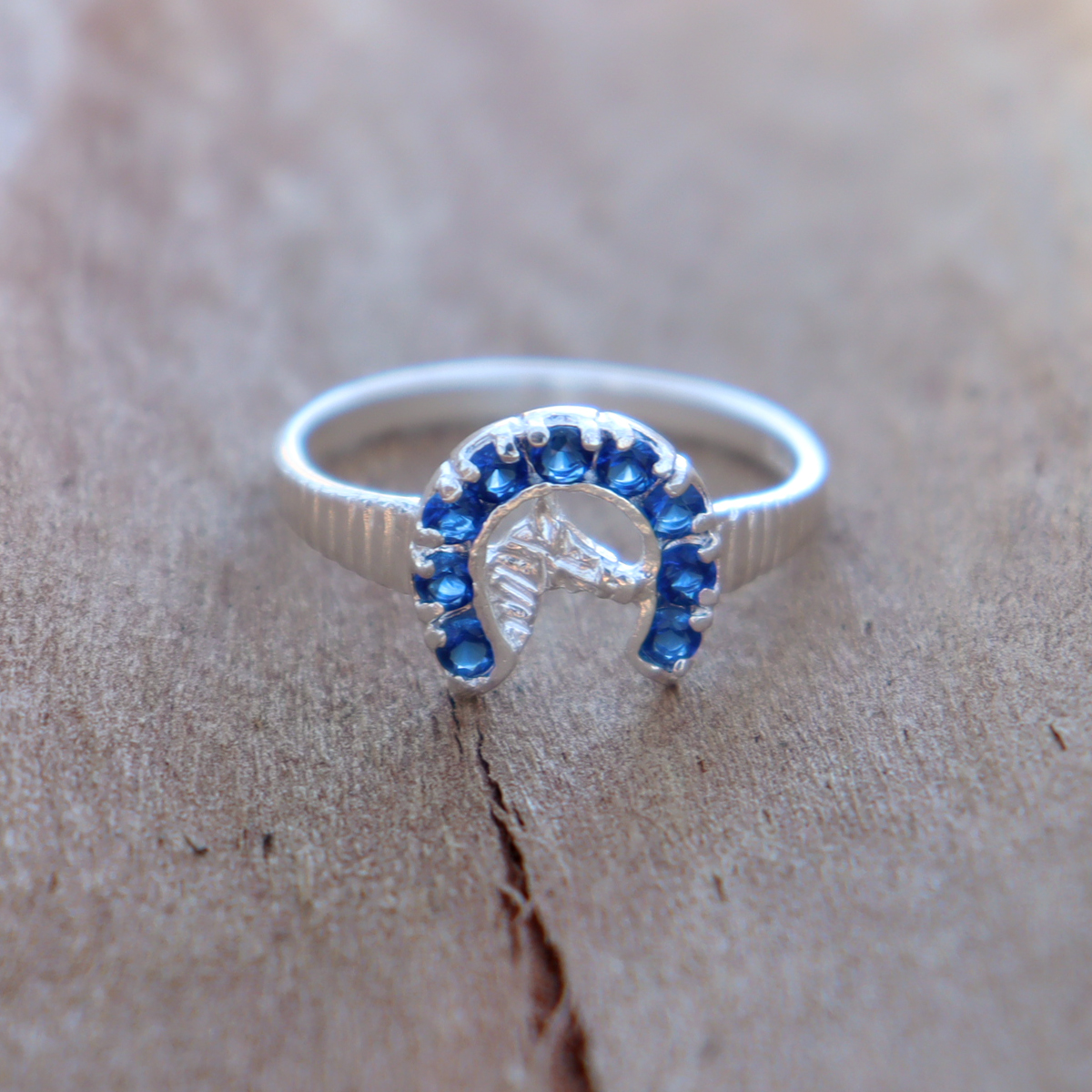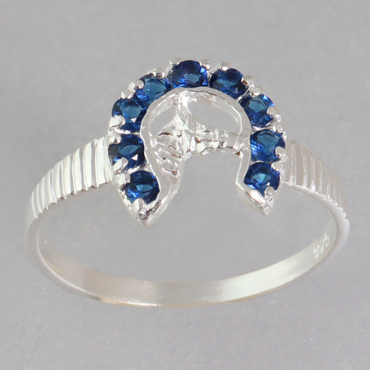 El anillo herradura plata 925 presenta un diseño central en forma de herradura decorada con zirconias azules que aportan un toque brillante y sofisticado. Estas piedras reflejan la luz de manera delicada, creando un contraste elegante con el tono plateado del anillo.