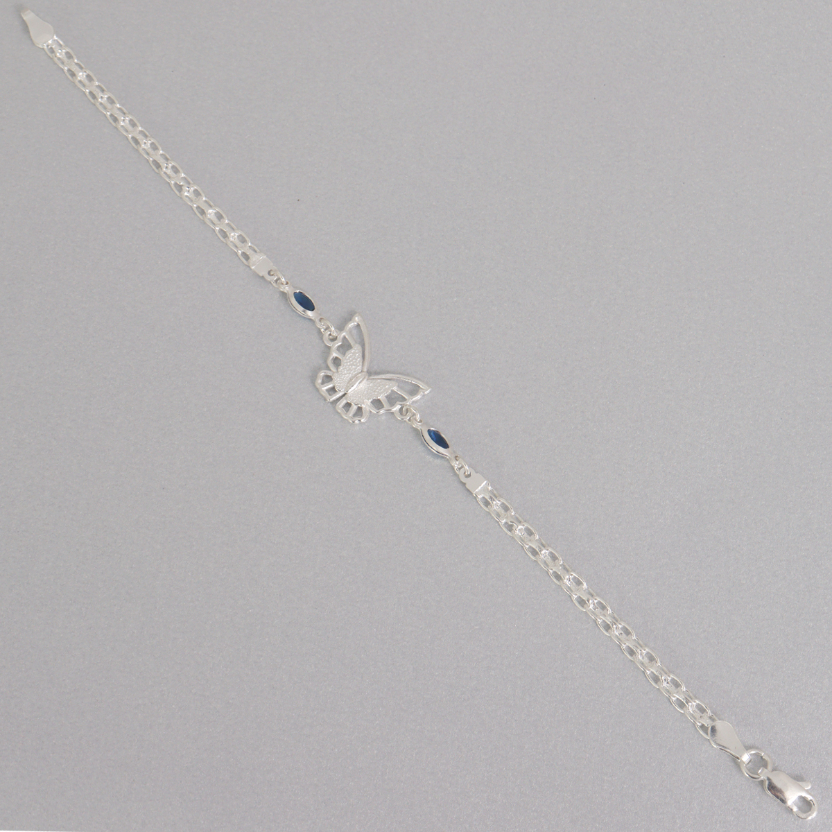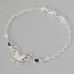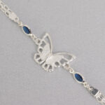 A cada lado de la mariposa, esta pulsera de plata 925 incorpora zirconias en tono azul intenso que evocan la profundidad del zafiro. Estas piedras aportan un contraste vibrante con la plata, elevando el diseño y añadiendo un toque de color sofisticado. El brillo de las zirconias complementa perfectamente el acabado pulido de la pulsera de plata 925, logrando un equilibrio entre frescura y elegancia.