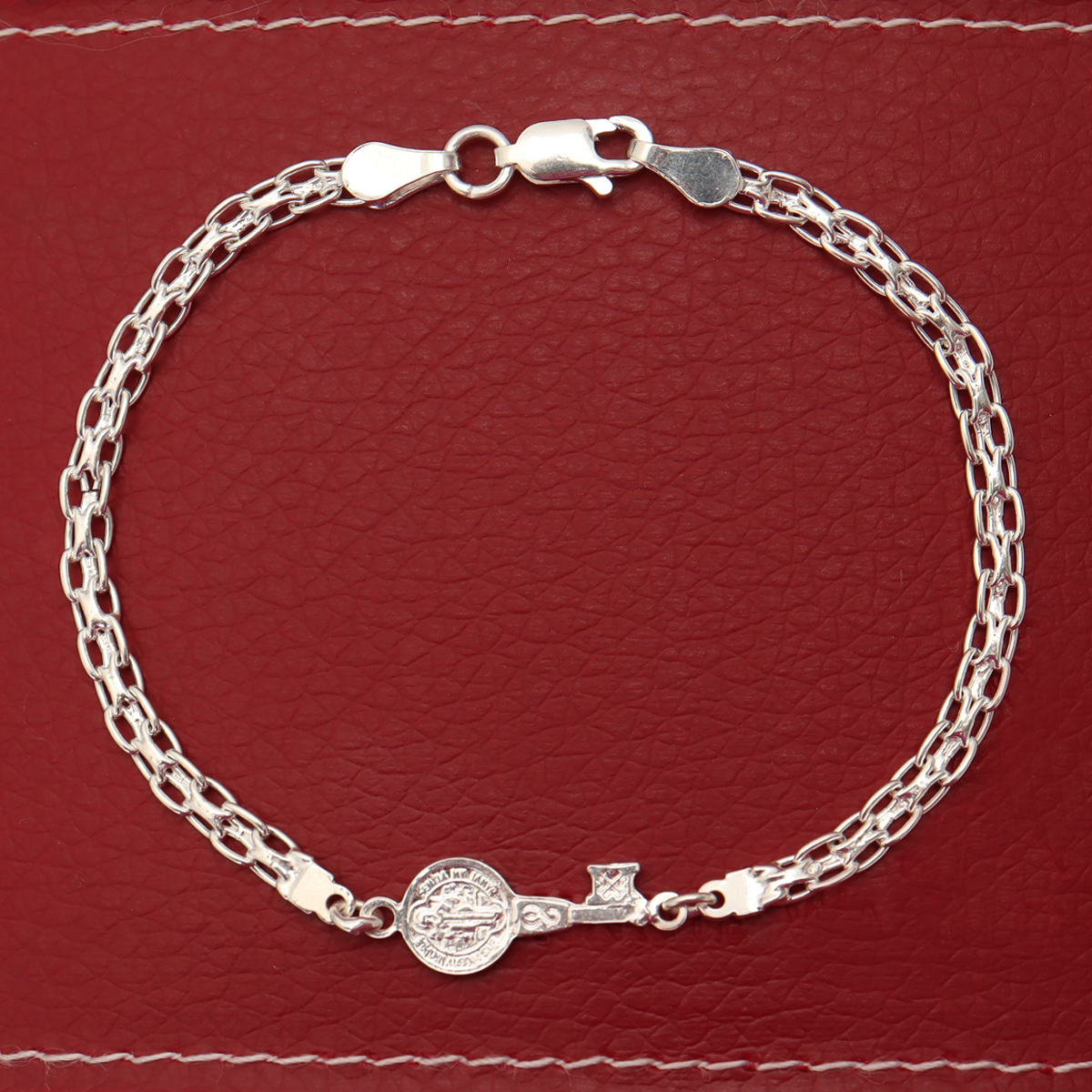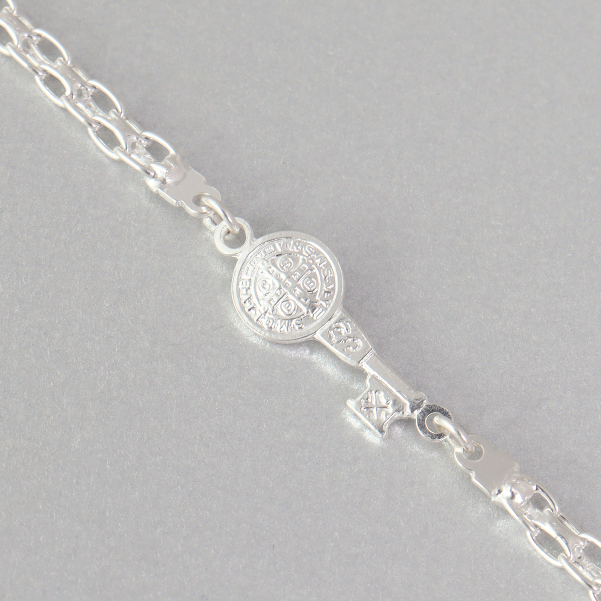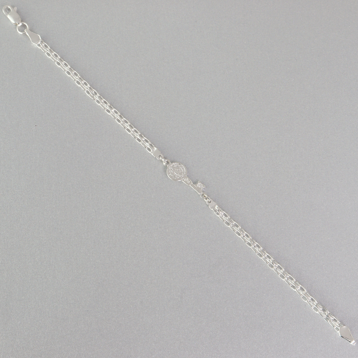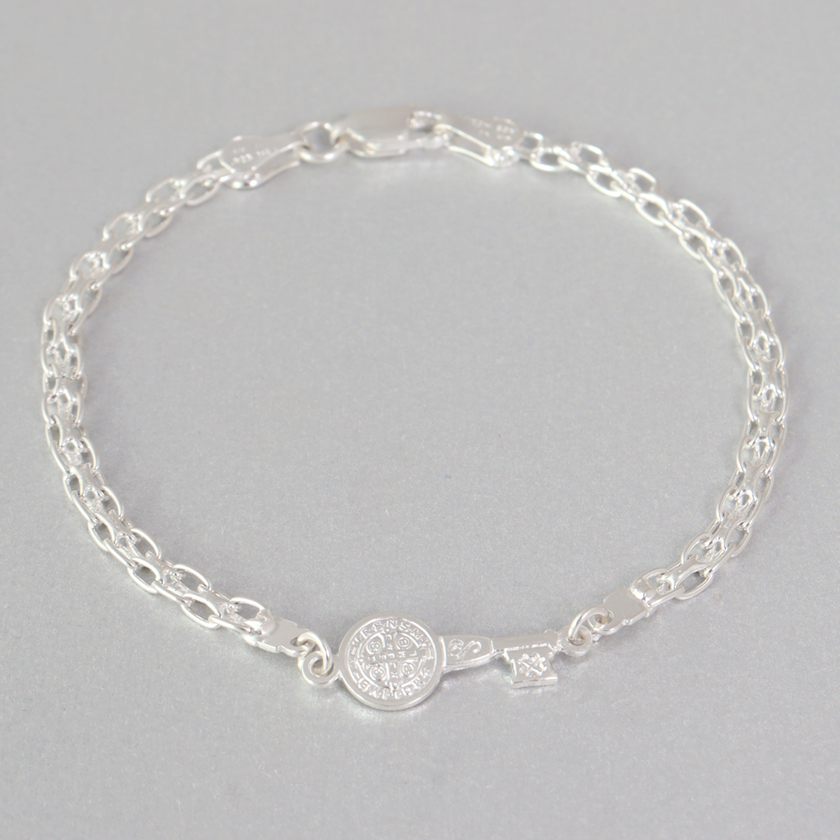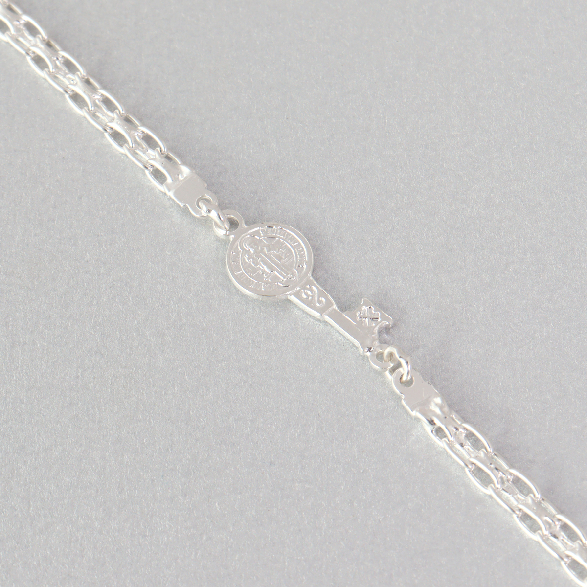 En la parte central, esta pulsera de plata 925 incorpora una medalla de San Benito, símbolo ampliamente reconocido de protección y fe. La medalla está cuidadosamente detallada, permitiendo apreciar sus relieves y grabados con claridad. Este elemento convierte a la pulsera de plata 925 en una pieza no solo estética, sino también significativa. A un costado de la medalla se integra la pequeña cruz característica, complementando el diseño y reforzando su valor simbólico.